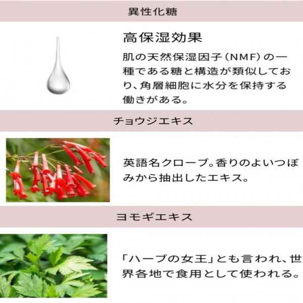 みなさんの肌が自ら作りだす天然保湿成分NMFの一種である糖と構造が似ている「異性化糖」は、潤いとくっつきその潤いを肌に長時間とどめてくれる働きがあります。
